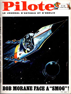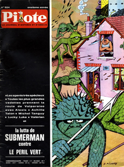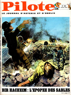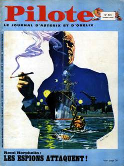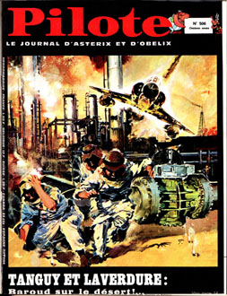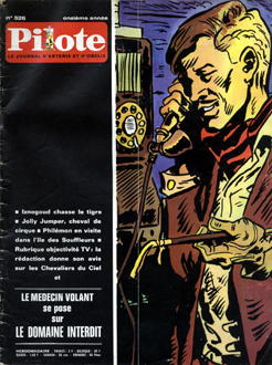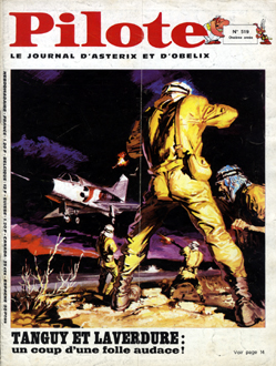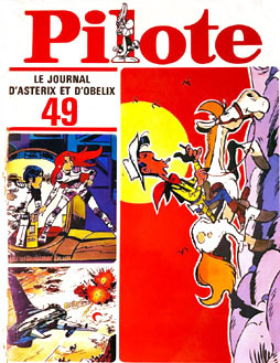 couverture est noire avec, en haut, le titre Pilote sur fond rouge,